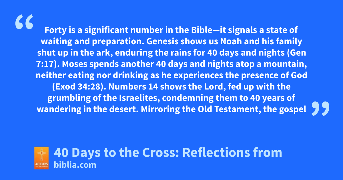 Forty is a significant number in the Bible—it signals a state of waiting and preparation. Genesis shows us Noah and his family shut up in the ark, enduring the rains for 40 days and nights (Gen 7:17). Moses spends another 40 days and nights atop a mountain, neither eating nor drinking as he experiences the presence of God (Exod 34:28). Numbers 14 shows the Lord, fed up with the grumbling of the Israelites, condemning them to 40 years of wandering in the desert. Mirroring the Old Testament, the gospel