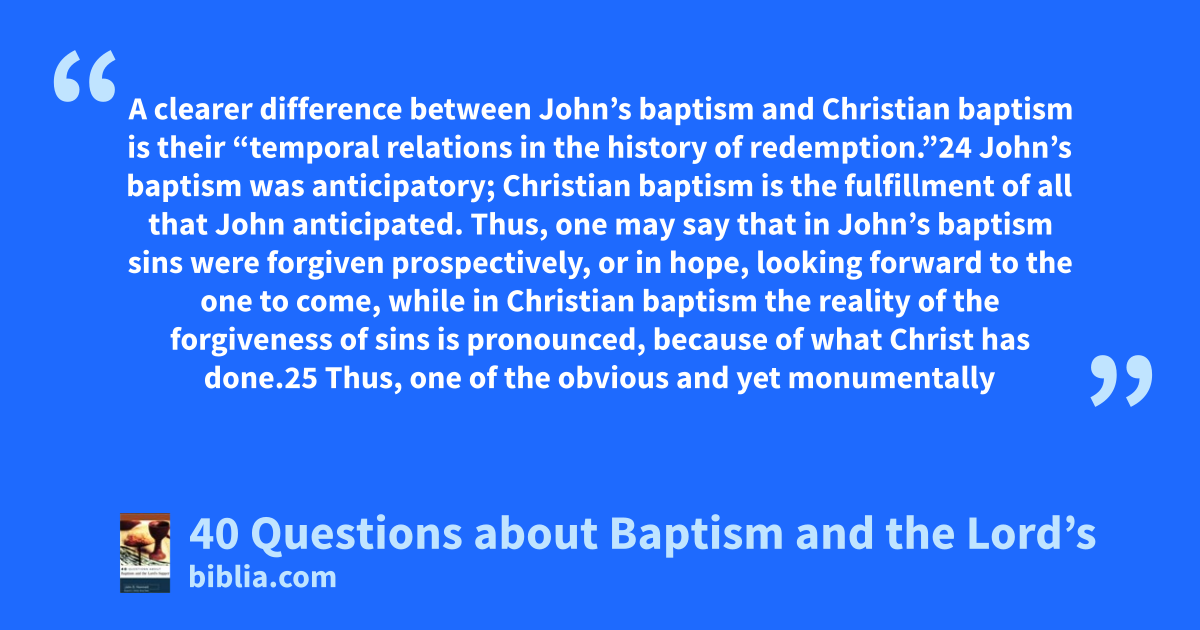 A clearer difference between John’s baptism and Christian baptism is their “temporal relations in the history of redemption.”24 John’s baptism was anticipatory; Christian baptism is the fulfillment of all that John anticipated. Thus, one may say that in John’s baptism sins were forgiven prospectively, or in hope, looking forward to the one to come, while in Christian baptism the reality of the forgiveness of sins is pronounced, because of what Christ has done.25 Thus, one of the obvious and yet monumentally