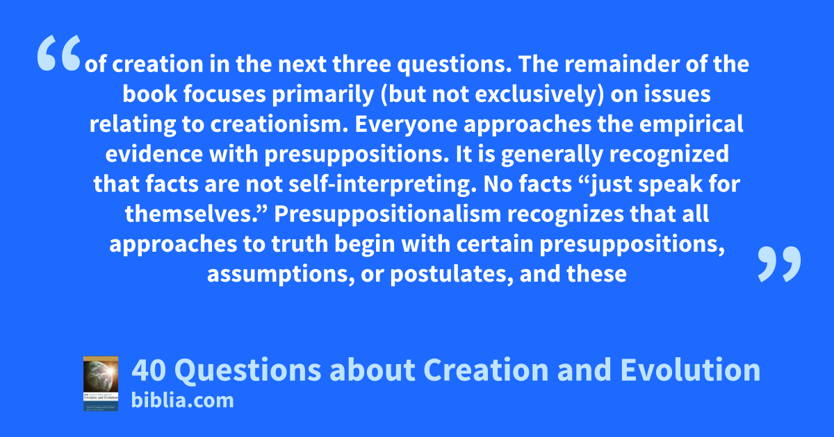 of creation in the next three questions. The remainder of the book focuses primarily (but not exclusively) on issues relating to creationism. Everyone approaches the empirical evidence with presuppositions. It is generally recognized that facts are not self-interpreting. No facts “just speak for themselves.” Presuppositionalism recognizes that all approaches to truth begin with certain presuppositions, assumptions, or postulates, and these