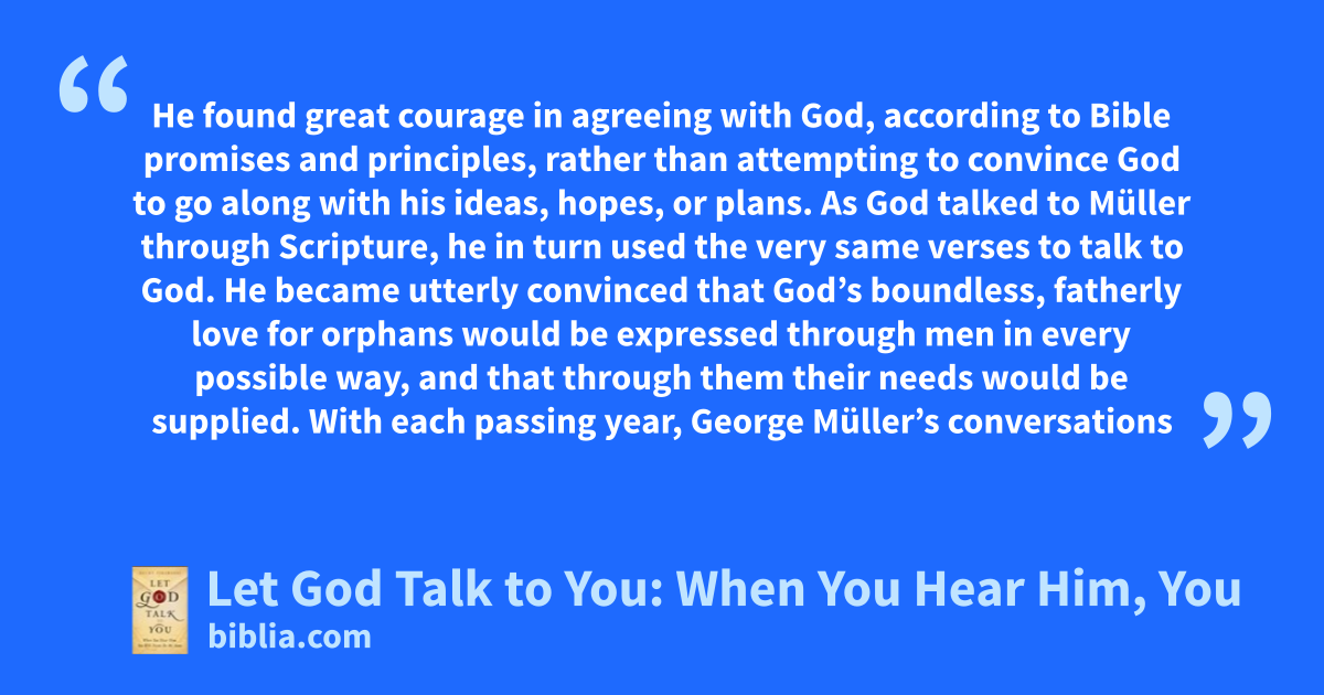 He found great courage in agreeing with God, according to Bible promises and principles, rather than attempting to convince God to go along with his ideas, hopes, or plans. As God talked to Müller through Scripture, he in turn used the very same verses to talk to God. He became utterly convinced that God’s boundless, fatherly love for orphans would be expressed through men in every possible way, and that through them their needs would be supplied. With each passing year, George Müller’s conversations