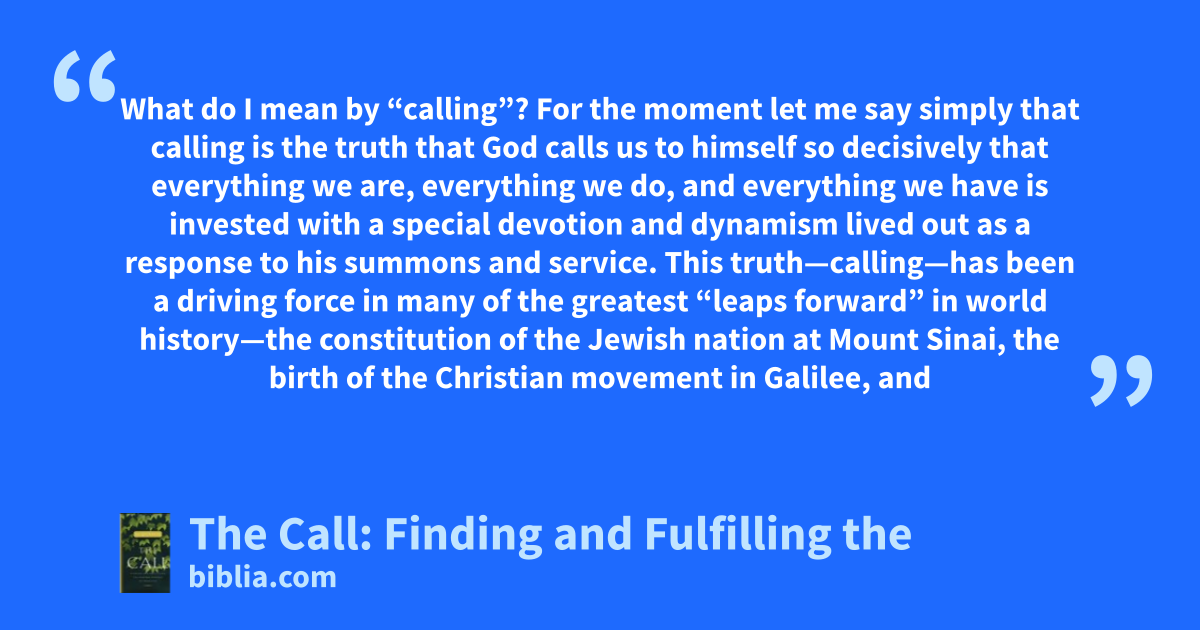 What do I mean by “calling”? For the moment let me say simply that calling is the truth that God calls us to himself so decisively that everything we are, everything we do, and everything we have is invested with a special devotion and dynamism lived out as a response to his summons and service. This truth—calling—has been a driving force in many of the greatest “leaps forward” in world history—the constitution of the Jewish nation at Mount Sinai, the birth of the Christian movement in Galilee, and