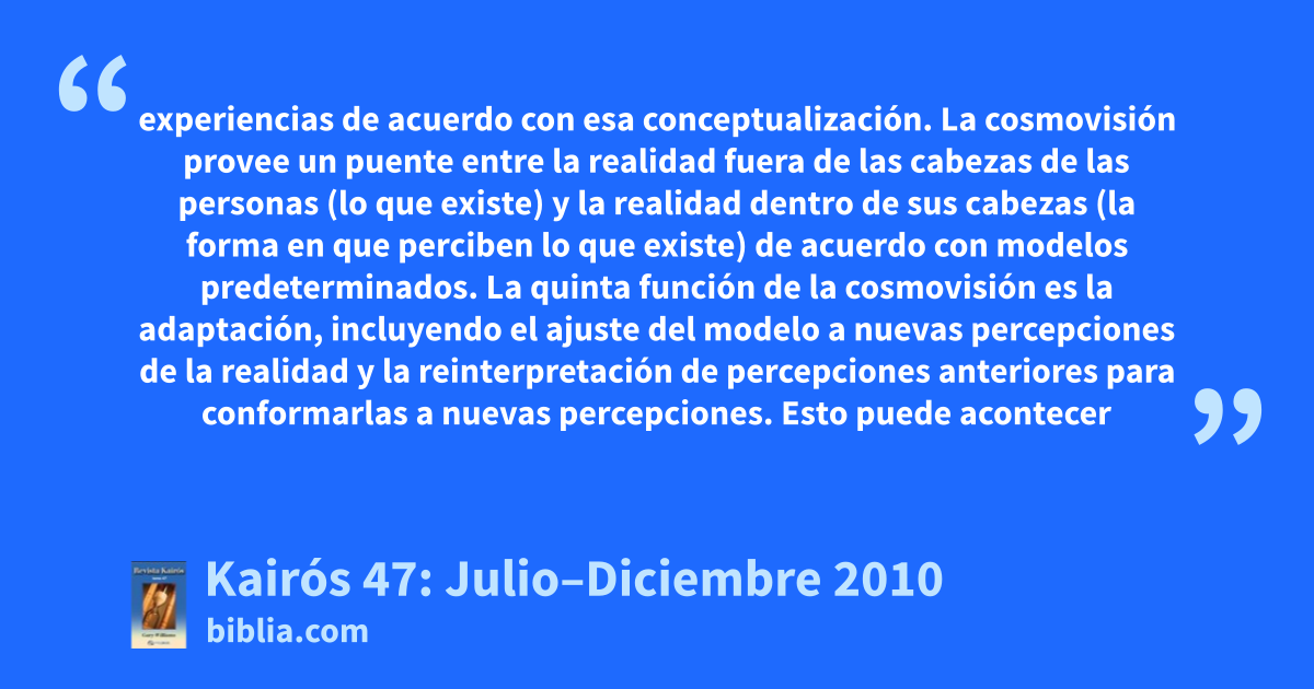 experiencias de acuerdo con esa conceptualización. La cosmovisión provee un puente entre la realidad fuera de las cabezas de las personas (lo que existe) y la realidad dentro de sus cabezas (la forma en que perciben lo que existe) de acuerdo con modelos predeterminados. La quinta función de la cosmovisión es la adaptación, incluyendo el ajuste del modelo a nuevas percepciones de la realidad y la reinterpretación de percepciones anteriores para conformarlas a nuevas percepciones. Esto puede acontecer