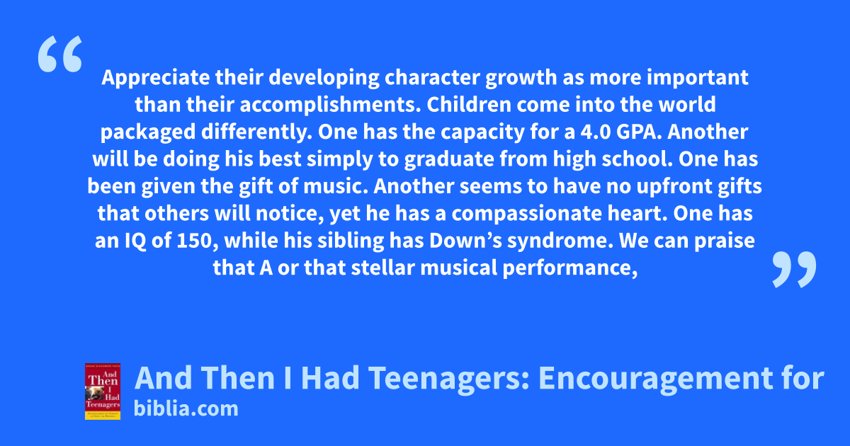 Appreciate their developing character growth as more important than their accomplishments. Children come into the world packaged differently. One has the capacity for a 4.0 GPA. Another will be doing his best simply to graduate from high school. One has been given the gift of music. Another seems to have no upfront gifts that others will notice, yet he has a compassionate heart. One has an IQ of 150, while his sibling has Down’s syndrome. We can praise that A or that stellar musical performance,