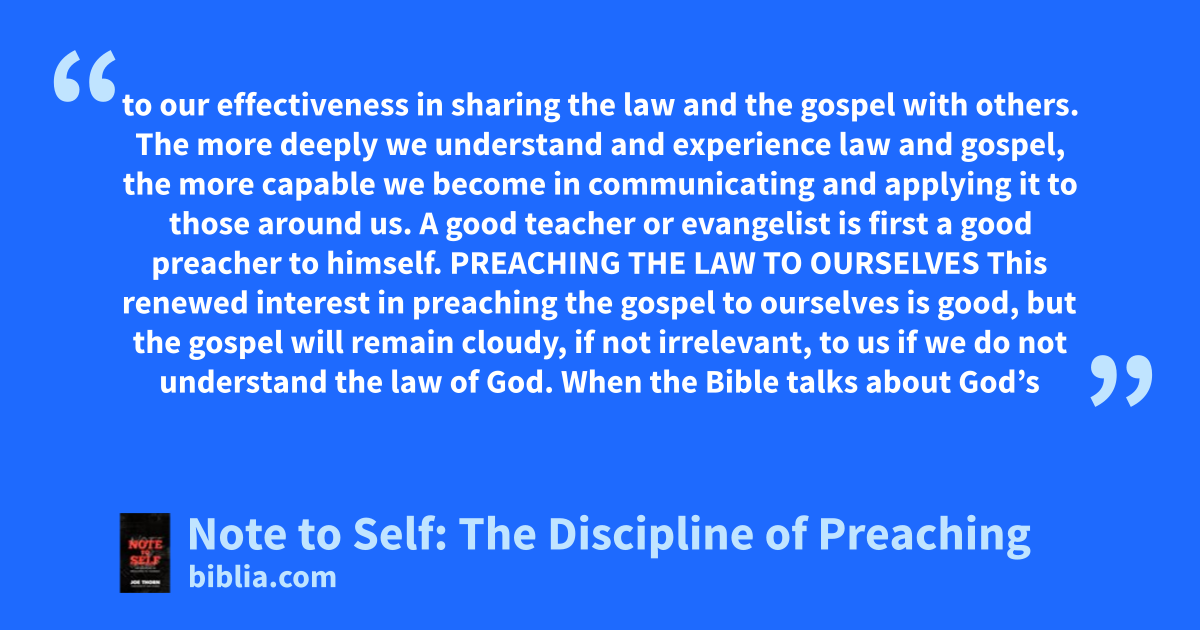 to our effectiveness in sharing the law and the gospel with others. The more deeply we understand and experience law and gospel, the more capable we become in communicating and applying it to those around us. A good teacher or evangelist is first a good preacher to himself. PREACHING THE LAW TO OURSELVES This renewed interest in preaching the gospel to ourselves is good, but the gospel will remain cloudy, if not irrelevant, to us if we do not understand the law of God. When the Bible talks about God’s