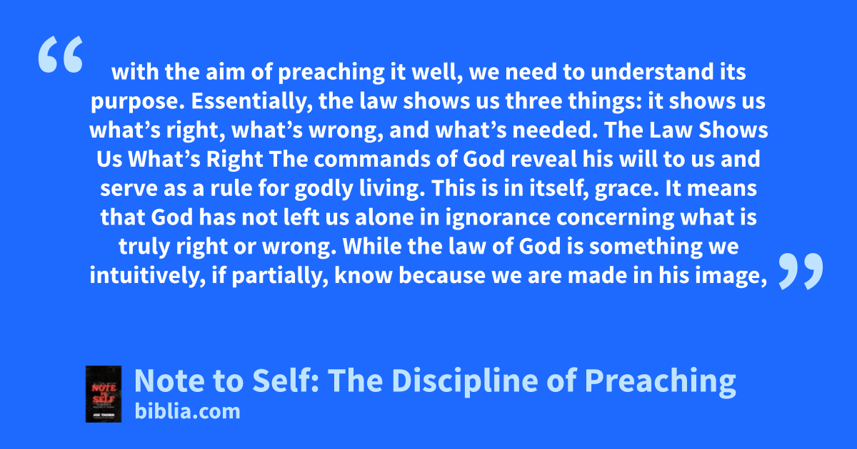 with the aim of preaching it well, we need to understand its purpose. Essentially, the law shows us three things: it shows us what’s right, what’s wrong, and what’s needed. The Law Shows Us What’s Right The commands of God reveal his will to us and serve as a rule for godly living. This is in itself, grace. It means that God has not left us alone in ignorance concerning what is truly right or wrong. While the law of God is something we intuitively, if partially, know because we are made in his image,