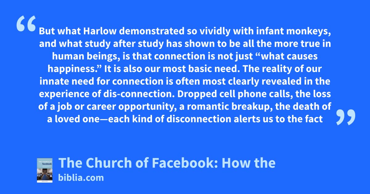But what Harlow demonstrated so vividly with infant monkeys, and what study after study has shown to be all the more true in human beings, is that connection is not just “what causes happiness.” It is also our most basic need. The reality of our innate need for connection is often most clearly revealed in the experience of dis-connection. Dropped cell phone calls, the loss of a job or career opportunity, a romantic breakup, the death of a loved one—each kind of disconnection alerts us to the fact