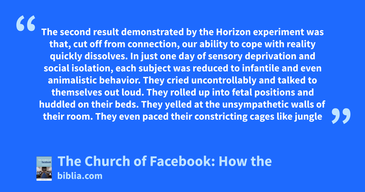 The second result demonstrated by the Horizon experiment was that, cut off from connection, our ability to cope with reality quickly dissolves. In just one day of sensory deprivation and social isolation, each subject was reduced to infantile and even animalistic behavior. They cried uncontrollably and talked to themselves out loud. They rolled up into fetal positions and huddled on their beds. They yelled at the unsympathetic walls of their room. They even paced their constricting cages like jungle