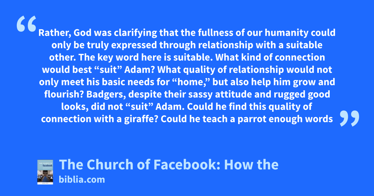 Rather, God was clarifying that the fullness of our humanity could only be truly expressed through relationship with a suitable other. The key word here is suitable. What kind of connection would best “suit” Adam? What quality of relationship would not only meet his basic needs for “home,” but also help him grow and flourish? Badgers, despite their sassy attitude and rugged good looks, did not “suit” Adam. Could he find this quality of connection with a giraffe? Could he teach a parrot enough words