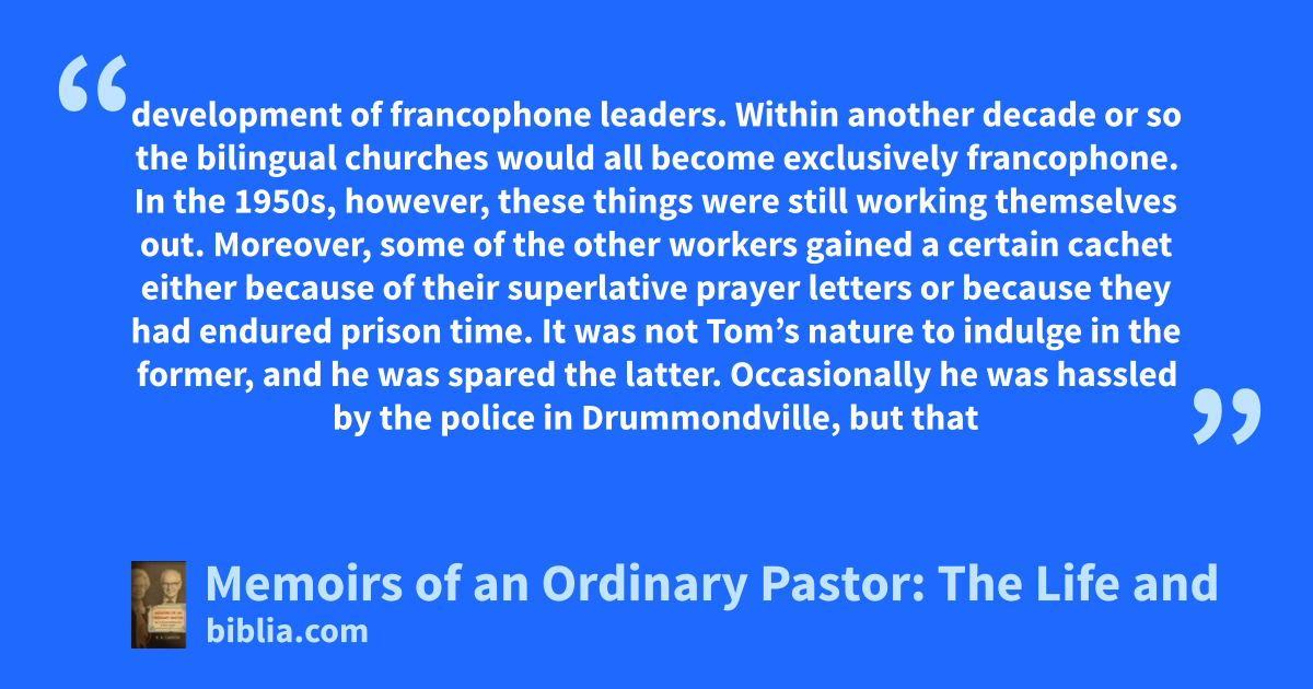 A memorable firsthand account of not only the sacrifices and triumphs of full-time ministry but of a brutal, little-known era in North American church history. D. A. Carson's father was a pioneering church-planter and pastor in Quebec. But still, an ordinary pastor-except that he ministered during the decades that brought French Canada from the brutal challenges of persecution and imprisonment...