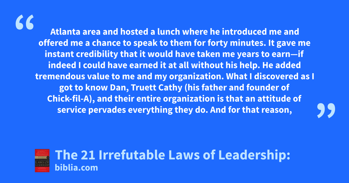 Atlanta area and hosted a lunch where he introduced me and offered me a chance to speak to them for forty minutes. It gave me instant credibility that it would have taken me years to earn—if indeed I could have earned it at all without his help. He added tremendous value to me and my organization. What I discovered as I got to know Dan, Truett Cathy (his father and founder of Chick-fil-A), and their entire organization is that an attitude of service pervades everything they do. And for that reason,
