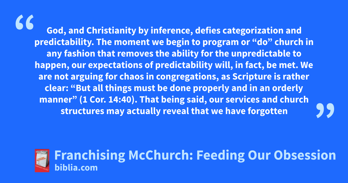 God, and Christianity by inference, defies categorization and predictability. The moment we begin to program or “do” church in any fashion that removes the ability for the unpredictable to happen, our expectations of predictability will, in fact, be met. We are not arguing for chaos in congregations, as Scripture is rather clear: “But all things must be done properly and in an orderly manner” (1 Cor. 14:40). That being said, our services and church structures may actually reveal that we have forgotten