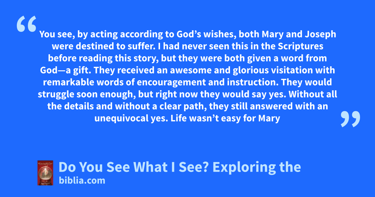 You see, by acting according to God’s wishes, both Mary and Joseph were destined to suffer. I had never seen this in the Scriptures before reading this story, but they were both given a word from God—a gift. They received an awesome and glorious visitation with remarkable words of encouragement and instruction. They would struggle soon enough, but right now they would say yes. Without all the details and without a clear path, they still answered with an unequivocal yes. Life wasn’t easy for Mary