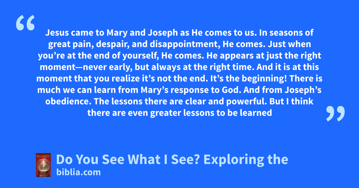 Jesus came to Mary and Joseph as He comes to us. In seasons of great pain, despair, and disappointment, He comes. Just when you’re at the end of yourself, He comes. He appears at just the right moment—never early, but always at the right time. And it is at this moment that you realize it’s not the end. It’s the beginning! There is much we can learn from Mary’s response to God. And from Joseph’s obedience. The lessons there are clear and powerful. But I think there are even greater lessons to be learned