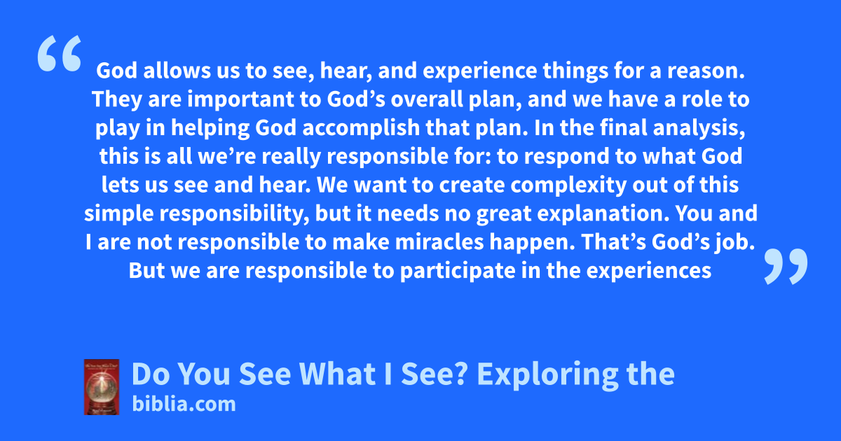 God allows us to see, hear, and experience things for a reason. They are important to God’s overall plan, and we have a role to play in helping God accomplish that plan. In the final analysis, this is all we’re really responsible for: to respond to what God lets us see and hear. We want to create complexity out of this simple responsibility, but it needs no great explanation. You and I are not responsible to make miracles happen. That’s God’s job. But we are responsible to participate in the experiences
