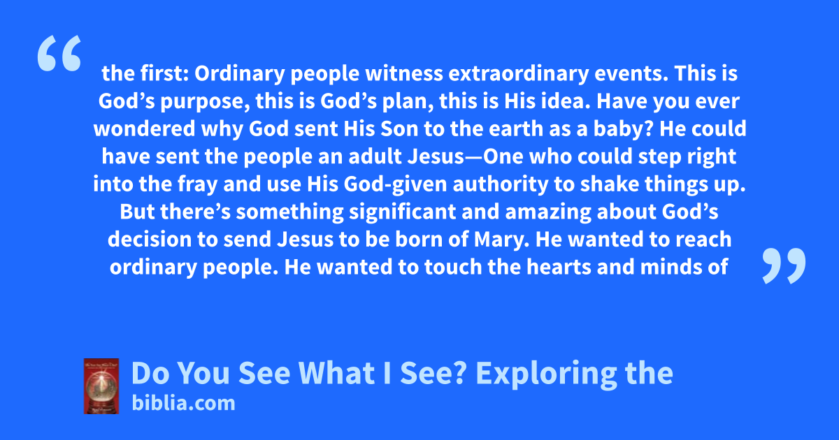 the first: Ordinary people witness extraordinary events. This is God’s purpose, this is God’s plan, this is His idea. Have you ever wondered why God sent His Son to the earth as a baby? He could have sent the people an adult Jesus—One who could step right into the fray and use His God-given authority to shake things up. But there’s something significant and amazing about God’s decision to send Jesus to be born of Mary. He wanted to reach ordinary people. He wanted to touch the hearts and minds of
