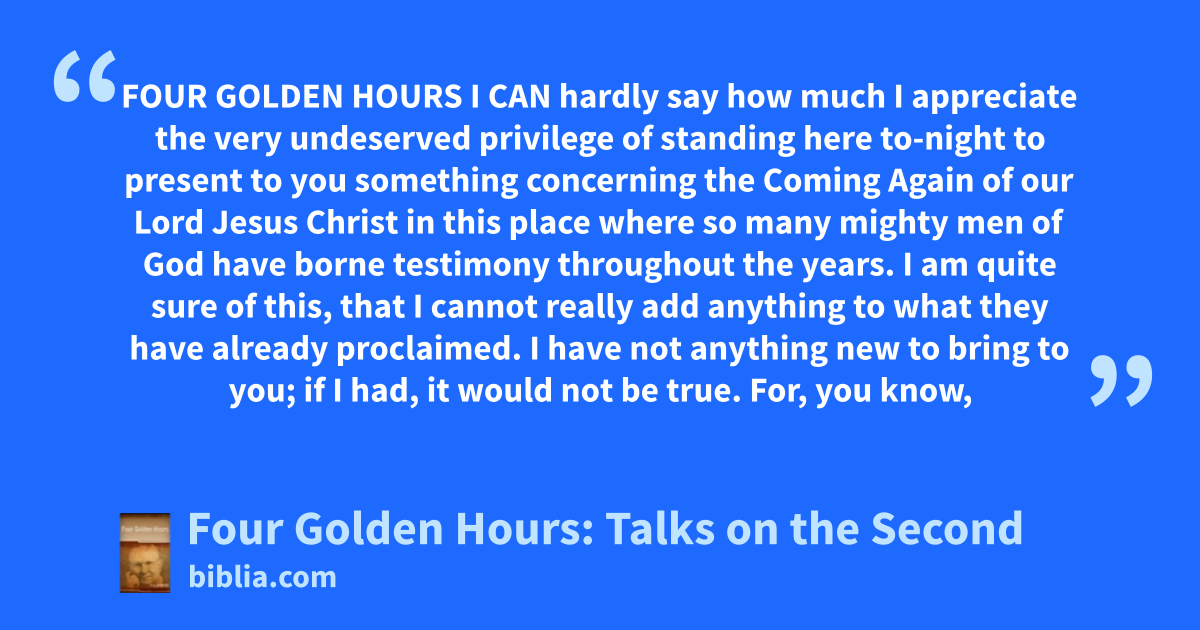 FOUR GOLDEN HOURS I CAN hardly say how much I appreciate the very undeserved privilege of standing here to-night to present to you something concerning the Coming Again of our Lord Jesus Christ in this place where so many mighty men of God have borne testimony throughout the years. I am quite sure of this, that I cannot really add anything to what they have already proclaimed. I have not anything new to bring to you; if I had, it would not be true. For, you know,