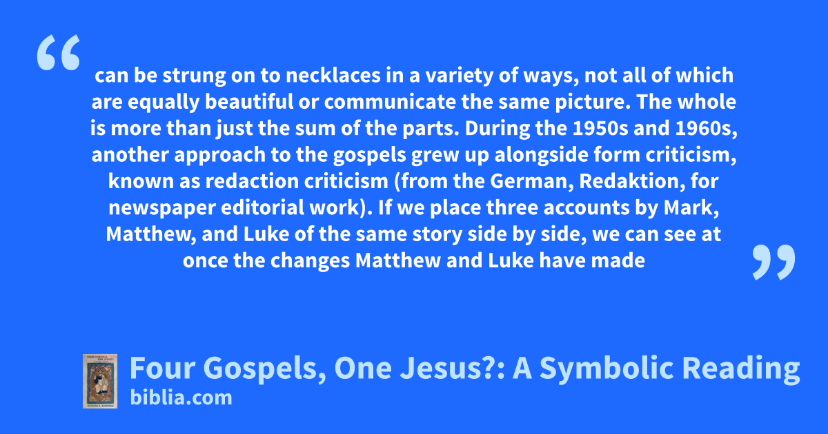 can be strung on to necklaces in a variety of ways, not all of which are equally beautiful or communicate the same picture. The whole is more than just the sum of the parts. During the 1950s and 1960s, another approach to the gospels grew up alongside form criticism, known as redaction criticism (from the German, Redaktion, for newspaper editorial work). If we place three accounts by Mark, Matthew, and Luke of the same story side by side, we can see at once the changes Matthew and Luke have made