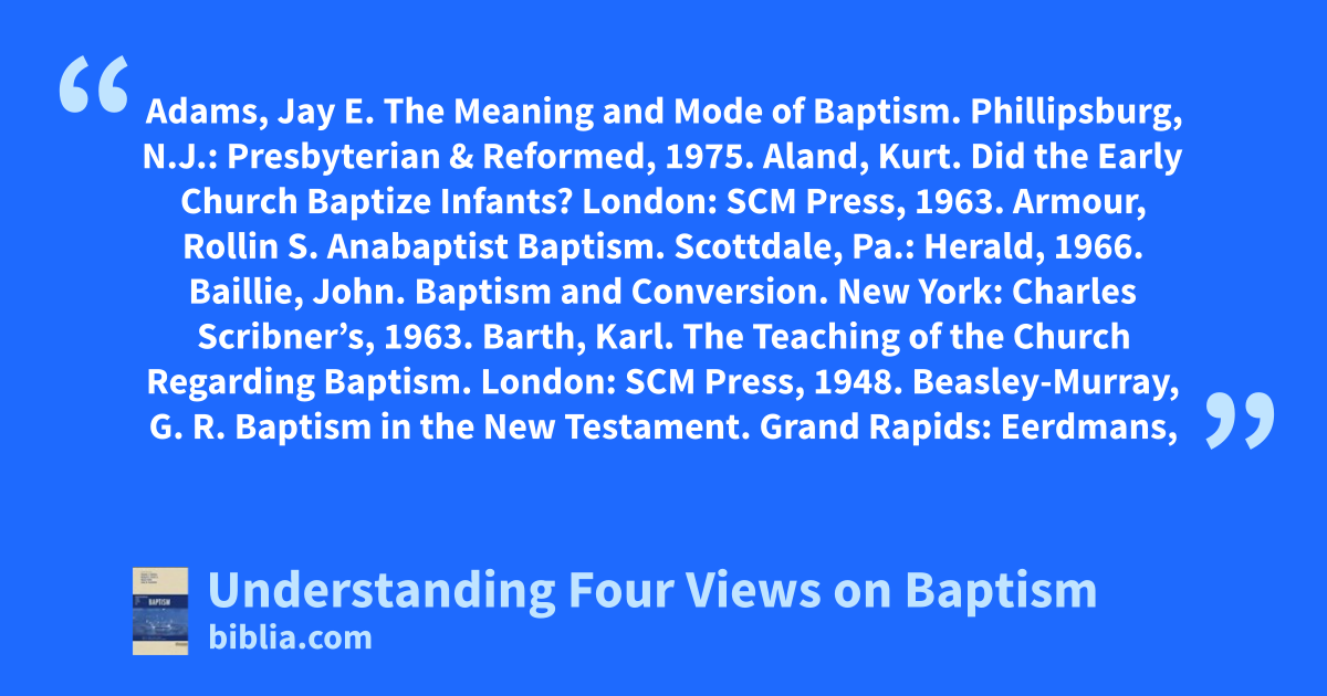 Adams, Jay E. The Meaning and Mode of Baptism. Phillipsburg, N.J.: Presbyterian & Reformed, 1975. Aland, Kurt. Did the Early Church Baptize Infants? London: SCM Press, 1963. Armour, Rollin S. Anabaptist Baptism. Scottdale, Pa.: Herald, 1966. Baillie, John. Baptism and Conversion. New York: Charles Scribner’s, 1963. Barth, Karl. The Teaching of the Church Regarding Baptism. London: SCM Press, 1948. Beasley-Murray, G. R. Baptism in the New Testament. Grand Rapids: Eerdmans,