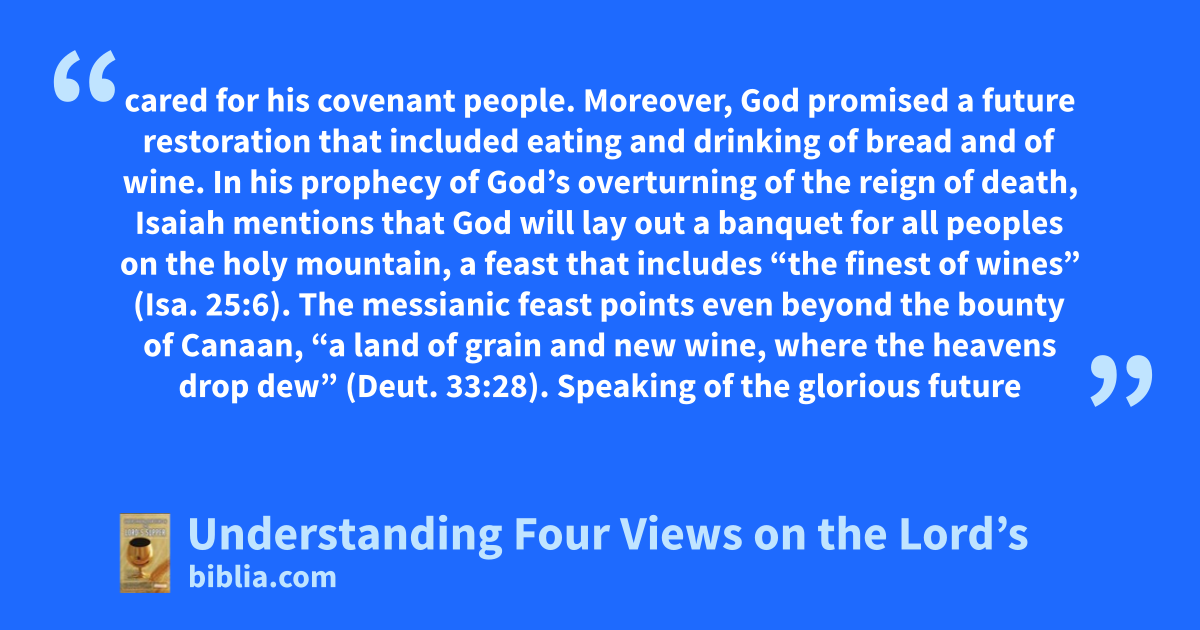 cared for his covenant people. Moreover, God promised a future restoration that included eating and drinking of bread and of wine. In his prophecy of God’s overturning of the reign of death, Isaiah mentions that God will lay out a banquet for all peoples on the holy mountain, a feast that includes “the finest of wines” (Isa. 25:6). The messianic feast points even beyond the bounty of Canaan, “a land of grain and new wine, where the heavens drop dew” (Deut. 33:28). Speaking of the glorious future