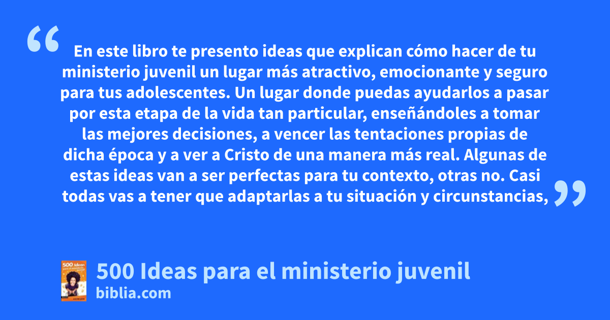 En este libro te presento ideas que explican cómo hacer de tu ministerio juvenil un lugar más atractivo, emocionante y seguro para tus adolescentes. Un lugar donde puedas ayudarlos a pasar por esta etapa de la vida tan particular, enseñándoles a tomar las mejores decisiones, a vencer las tentaciones propias de dicha época y a ver a Cristo de una manera más real. Algunas de estas ideas van a ser perfectas para tu contexto, otras no. Casi todas vas a tener que adaptarlas a tu situación y circunstancias,