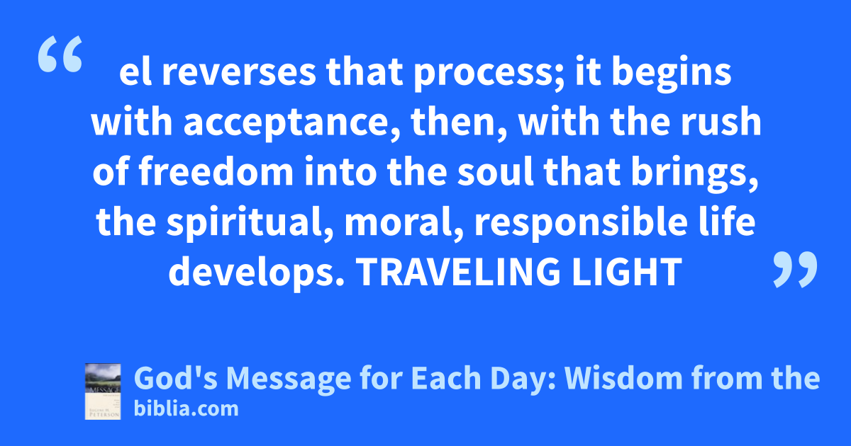 el reverses that process; it begins with acceptance, then, with the rush of freedom into the soul that brings, the spiritual, moral, responsible life develops. TRAVELING LIGHT