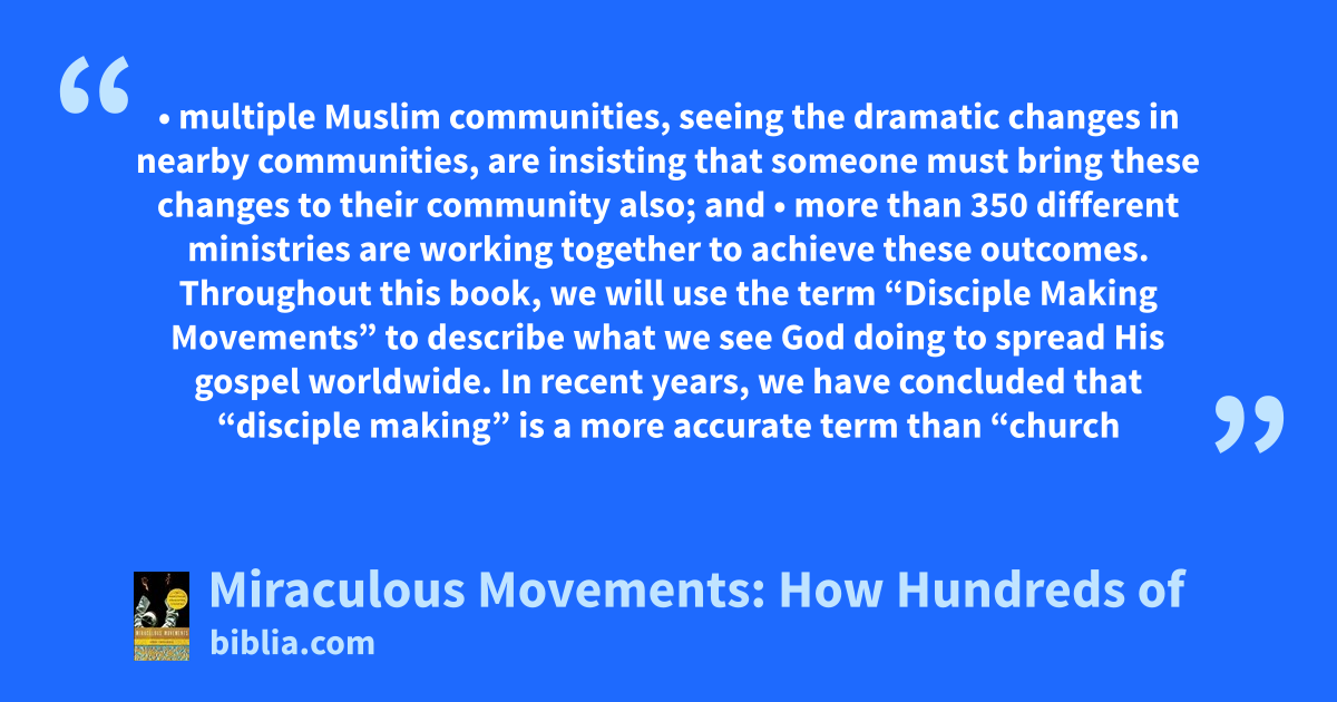 • multiple Muslim communities, seeing the dramatic changes in nearby communities, are insisting that someone must bring these changes to their community also; and • more than 350 different ministries are working together to achieve these outcomes. Throughout this book, we will use the term “Disciple Making Movements” to describe what we see God doing to spread His gospel worldwide. In recent years, we have concluded that “disciple making” is a more accurate term than “church