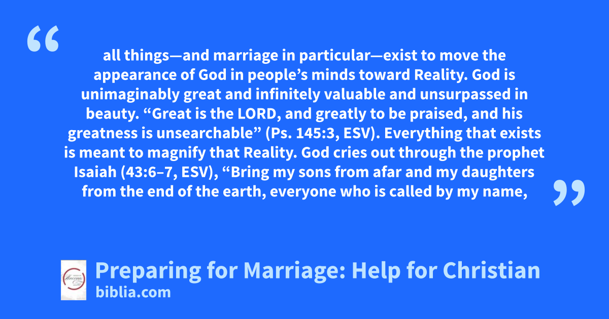 all things—and marriage in particular—exist to move the appearance of God in people’s minds toward Reality. God is unimaginably great and infinitely valuable and unsurpassed in beauty. “Great is the LORD, and greatly to be praised, and his greatness is unsearchable” (Ps. 145:3, ESV). Everything that exists is meant to magnify that Reality. God cries out through the prophet Isaiah (43:6–7, ESV), “Bring my sons from afar and my daughters from the end of the earth, everyone who is called by my name,