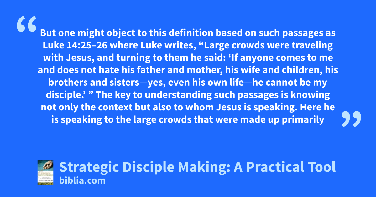 But one might object to this definition based on such passages as Luke 14:25–26 where Luke writes, “Large crowds were traveling with Jesus, and turning to them he said: ‘If anyone comes to me and does not hate his father and mother, his wife and children, his brothers and sisters—yes, even his own life—he cannot be my disciple.’ ” The key to understanding such passages is knowing not only the context but also to whom Jesus is speaking. Here he is speaking to the large crowds that were made up primarily