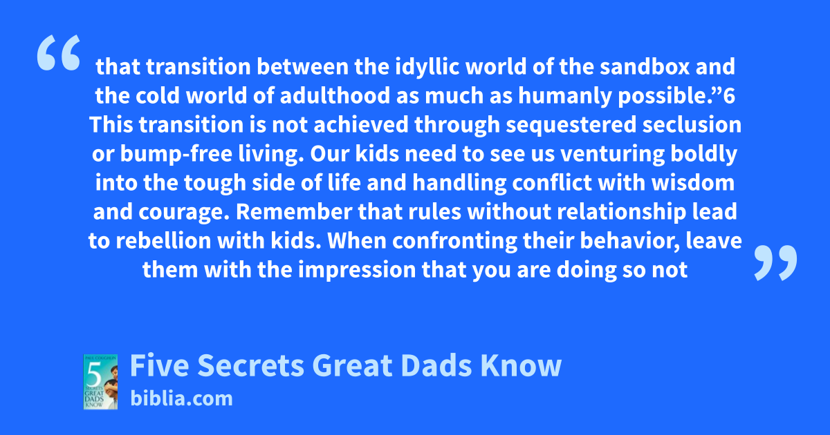 that transition between the idyllic world of the sandbox and the cold world of adulthood as much as humanly possible.”6 This transition is not achieved through sequestered seclusion or bump-free living. Our kids need to see us venturing boldly into the tough side of life and handling conflict with wisdom and courage. Remember that rules without relationship lead to rebellion with kids. When confronting their behavior, leave them with the impression that you are doing so not