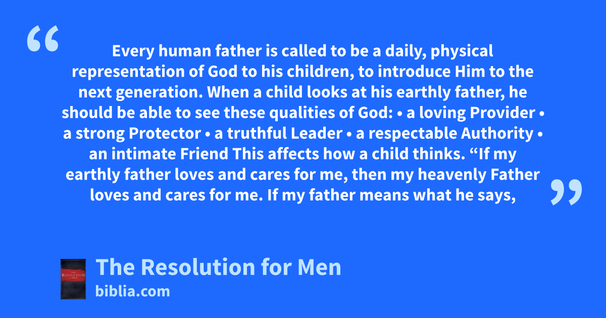 Every human father is called to be a daily, physical representation of God to his children, to introduce Him to the next generation. When a child looks at his earthly father, he should be able to see these qualities of God: • a loving Provider • a strong Protector • a truthful Leader • a respectable Authority • an intimate Friend This affects how a child thinks. “If my earthly father loves and cares for me, then my heavenly Father loves and cares for me. If my father means what he says,