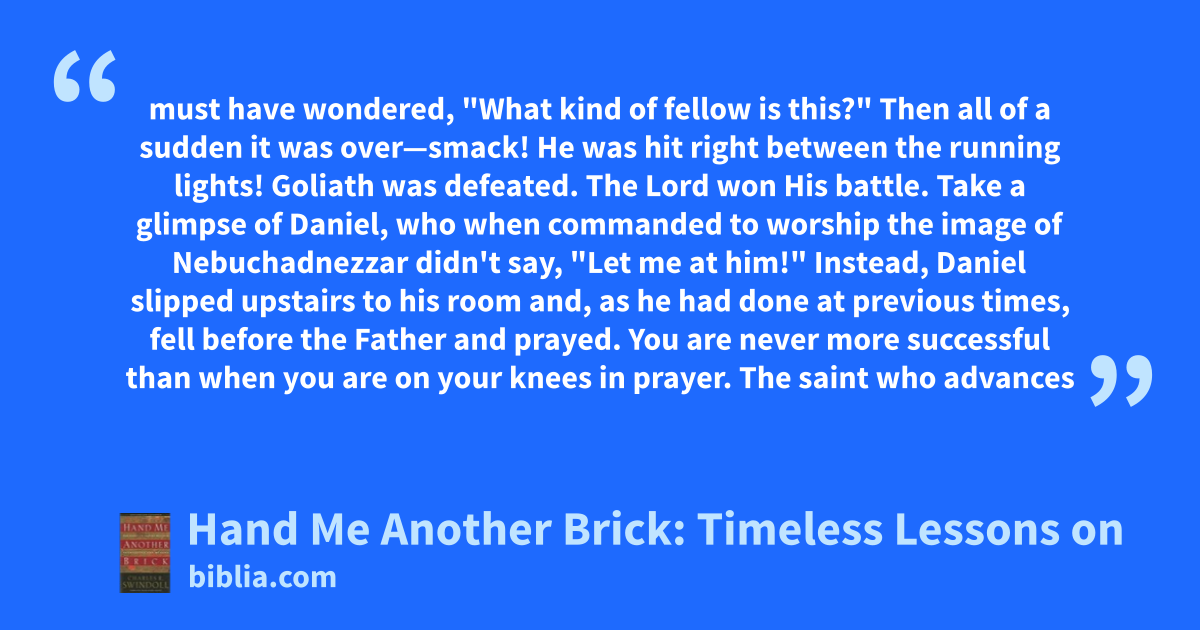 must have wondered, "What kind of fellow is this?" Then all of a sudden it was over—smack! He was hit right between the running lights! Goliath was defeated. The Lord won His battle. Take a glimpse of Daniel, who when commanded to worship the image of Nebuchadnezzar didn't say, "Let me at him!" Instead, Daniel slipped upstairs to his room and, as he had done at previous times, fell before the Father and prayed. You are never more successful than when you are on your knees in prayer. The saint who advances