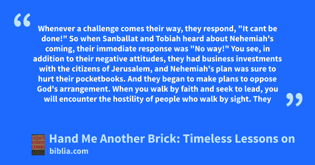 Whenever a challenge comes their way, they respond, "It cant be done!" So when Sanballat and Tobiah heard about Nehemiah's coming, their immediate response was "No way!" You see, in addition to their negative attitudes, they had business investments with the citizens of Jerusalem, and Nehemiah's plan was sure to hurt their pocketbooks. And they began to make plans to oppose God's arrangement. When you walk by faith and seek to lead, you will encounter the hostility of people who walk by sight. They