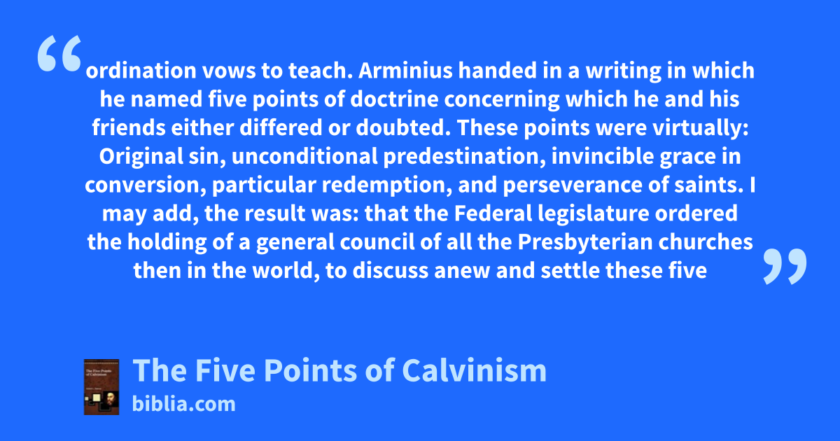 ordination vows to teach. Arminius handed in a writing in which he named five points of doctrine concerning which he and his friends either differed or doubted. These points were virtually: Original sin, unconditional predestination, invincible grace in conversion, particular redemption, and perseverance of saints. I may add, the result was: that the Federal legislature ordered the holding of a general council of all the Presbyterian churches then in the world, to discuss anew and settle these five