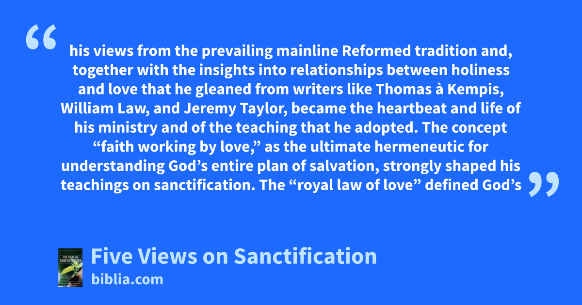 his views from the prevailing mainline Reformed tradition and, together with the insights into relationships between holiness and love that he gleaned from writers like Thomas à Kempis, William Law, and Jeremy Taylor, became the heartbeat and life of his ministry and of the teaching that he adopted. The concept “faith working by love,” as the ultimate hermeneutic for understanding God’s entire plan of salvation, strongly shaped his teachings on sanctification. The “royal law of love” defined God’s