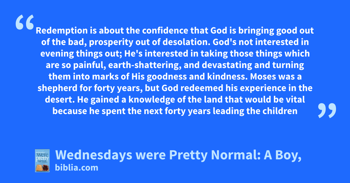 Redemption is about the confidence that God is bringing good out of the bad, prosperity out of desolation. God's not interested in evening things out; He's interested in taking those things which are so painful, earth-shattering, and devastating and turning them into marks of His goodness and kindness. Moses was a shepherd for forty years, but God redeemed his experience in the desert. He gained a knowledge of the land that would be vital because he spent the next forty years leading the children