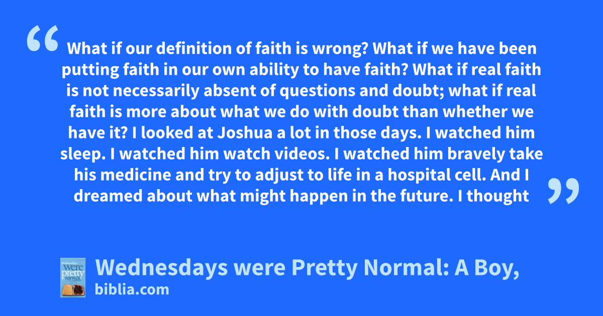 What if our definition of faith is wrong? What if we have been putting faith in our own ability to have faith? What if real faith is not necessarily absent of questions and doubt; what if real faith is more about what we do with doubt than whether we have it? I looked at Joshua a lot in those days. I watched him sleep. I watched him watch videos. I watched him bravely take his medicine and try to adjust to life in a hospital cell. And I dreamed about what might happen in the future. I thought