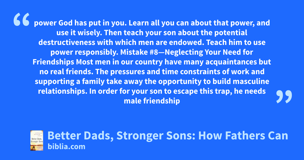 power God has put in you. Learn all you can about that power, and use it wisely. Then teach your son about the potential destructiveness with which men are endowed. Teach him to use power responsibly. Mistake #8—Neglecting Your Need for Friendships Most men in our country have many acquaintances but no real friends. The pressures and time constraints of work and supporting a family take away the opportunity to build masculine relationships. In order for your son to escape this trap, he needs male friendship