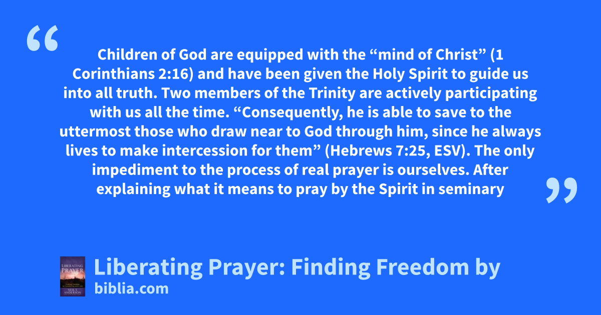 Children of God are equipped with the “mind of Christ” (1 Corinthians 2:16) and have been given the Holy Spirit to guide us into all truth. Two members of the Trinity are actively participating with us all the time. “Consequently, he is able to save to the uttermost those who draw near to God through him, since he always lives to make intercession for them” (Hebrews 7:25, ESV). The only impediment to the process of real prayer is ourselves. After explaining what it means to pray by the Spirit in seminary