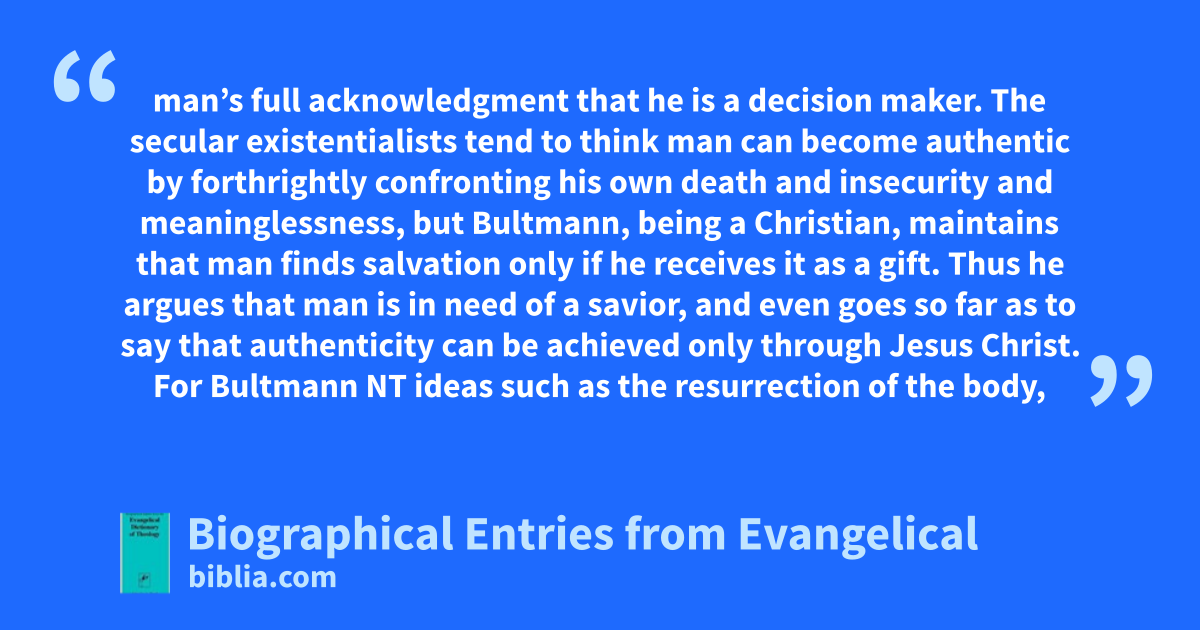 man’s full acknowledgment that he is a decision maker. The secular existentialists tend to think man can become authentic by forthrightly confronting his own death and insecurity and meaninglessness, but Bultmann, being a Christian, maintains that man finds salvation only if he receives it as a gift. Thus he argues that man is in need of a savior, and even goes so far as to say that authenticity can be achieved only through Jesus Christ. For Bultmann NT ideas such as the resurrection of the body,