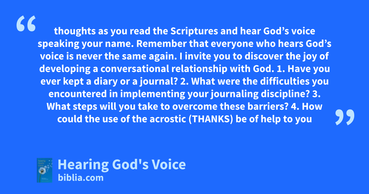 thoughts as you read the Scriptures and hear God’s voice speaking your name. Remember that everyone who hears God’s voice is never the same again. I invite you to discover the joy of developing a conversational relationship with God. 1. Have you ever kept a diary or a journal? 2. What were the difficulties you encountered in implementing your journaling discipline? 3. What steps will you take to overcome these barriers? 4. How could the use of the acrostic (THANKS) be of help to you