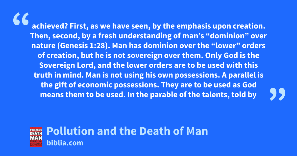 achieved? First, as we have seen, by the emphasis upon creation. Then, second, by a fresh understanding of man’s “dominion” over nature (Genesis 1:28). Man has dominion over the “lower” orders of creation, but he is not sovereign over them. Only God is the Sovereign Lord, and the lower orders are to be used with this truth in mind. Man is not using his own possessions. A parallel is the gift of economic possessions. They are to be used as God means them to be used. In the parable of the talents, told by