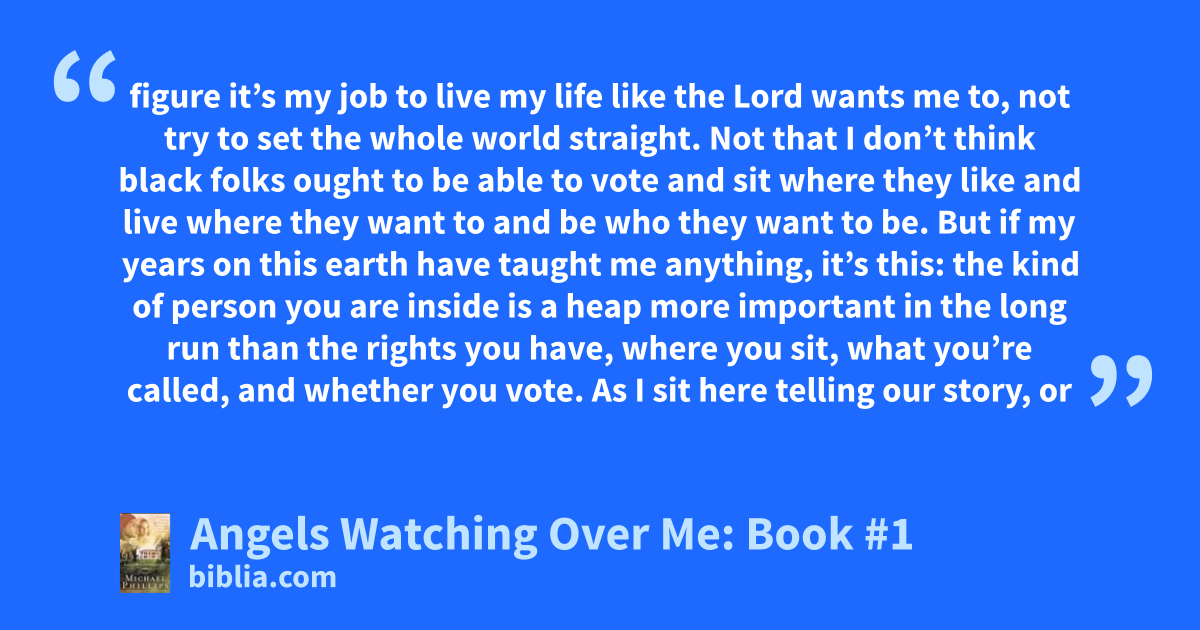 figure it’s my job to live my life like the Lord wants me to, not try to set the whole world straight. Not that I don’t think black folks ought to be able to vote and sit where they like and live where they want to and be who they want to be. But if my years on this earth have taught me anything, it’s this: the kind of person you are inside is a heap more important in the long run than the rights you have, where you sit, what you’re called, and whether you vote. As I sit here telling our story, or