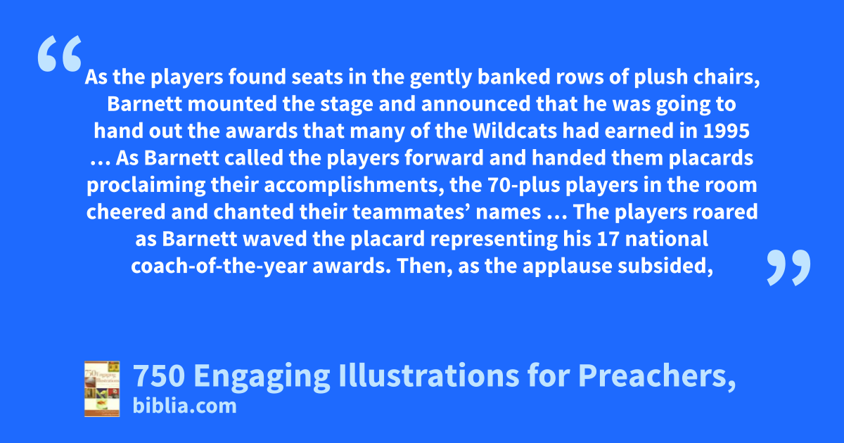 As the players found seats in the gently banked rows of plush chairs, Barnett mounted the stage and announced that he was going to hand out the awards that many of the Wildcats had earned in 1995 … As Barnett called the players forward and handed them placards proclaiming their accomplishments, the 70-plus players in the room cheered and chanted their teammates’ names … The players roared as Barnett waved the placard representing his 17 national coach-of-the-year awards. Then, as the applause subsided,