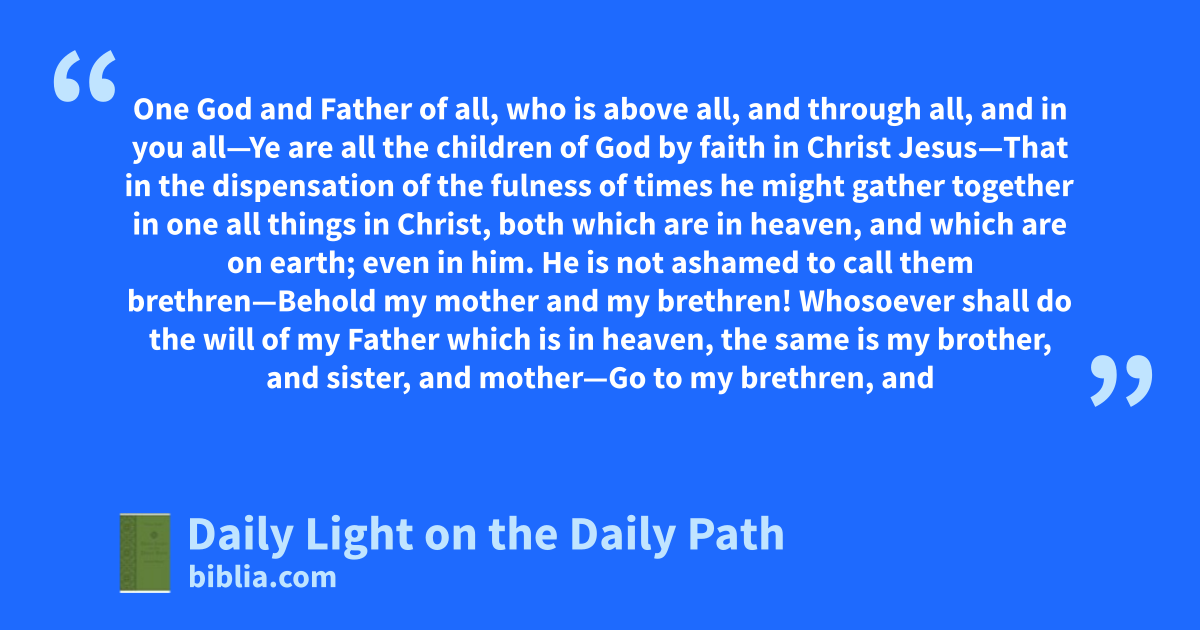 One God and Father of all, who is above all, and through all, and in you all—Ye are all the children of God by faith in Christ Jesus—That in the dispensation of the fulness of times he might gather together in one all things in Christ, both which are in heaven, and which are on earth; even in him. He is not ashamed to call them brethren—Behold my mother and my brethren! Whosoever shall do the will of my Father which is in heaven, the same is my brother, and sister, and mother—Go to my brethren, and