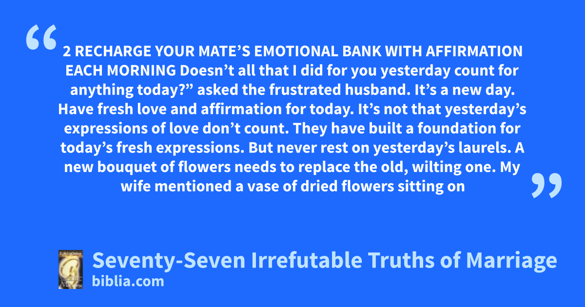 2 RECHARGE YOUR MATE’S EMOTIONAL BANK WITH AFFIRMATION EACH MORNING Doesn’t all that I did for you yesterday count for anything today?” asked the frustrated husband. It’s a new day. Have fresh love and affirmation for today. It’s not that yesterday’s expressions of love don’t count. They have built a foundation for today’s fresh expressions. But never rest on yesterday’s laurels. A new bouquet of flowers needs to replace the old, wilting one. My wife mentioned a vase of dried flowers sitting on
