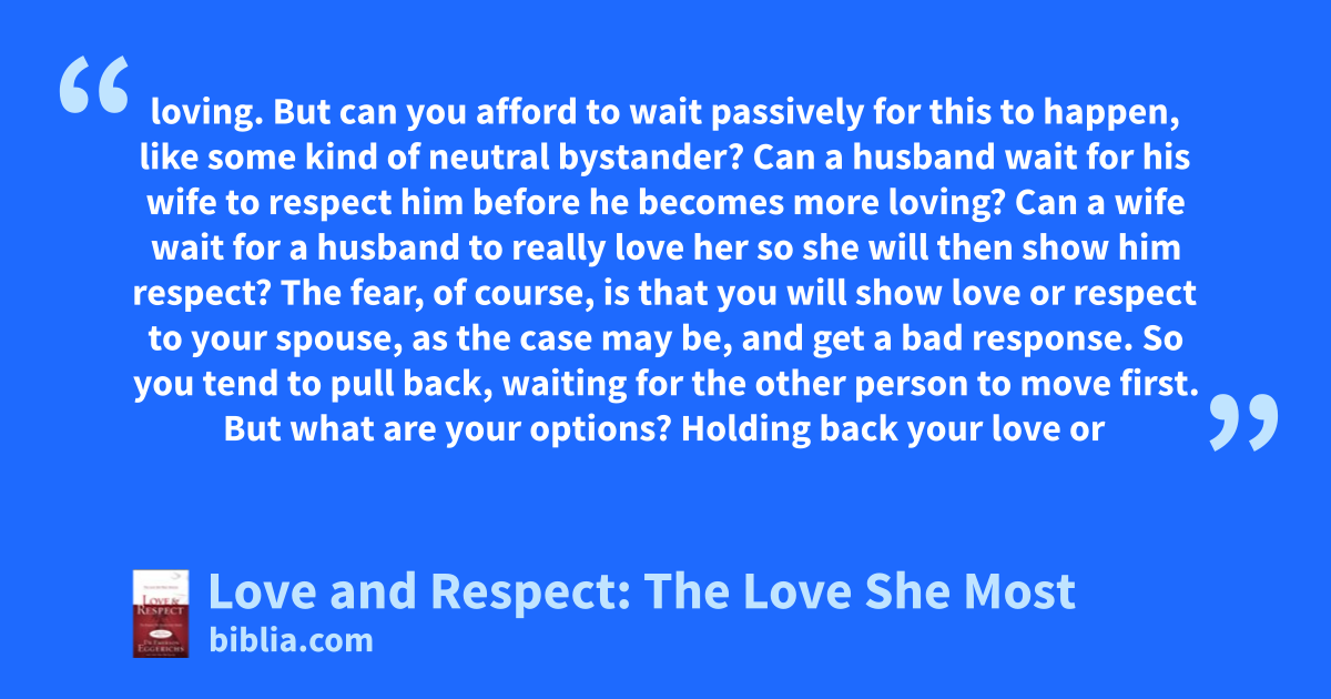 loving. But can you afford to wait passively for this to happen, like some kind of neutral bystander? Can a husband wait for his wife to respect him before he becomes more loving? Can a wife wait for a husband to really love her so she will then show him respect? The fear, of course, is that you will show love or respect to your spouse, as the case may be, and get a bad response. So you tend to pull back, waiting for the other person to move first. But what are your options? Holding back your love or