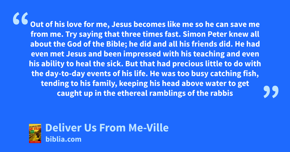 Out of his love for me, Jesus becomes like me so he can save me from me. Try saying that three times fast. Simon Peter knew all about the God of the Bible; he did and all his friends did. He had even met Jesus and been impressed with his teaching and even his ability to heal the sick. But that had precious little to do with the day-to-day events of his life. He was too busy catching fish, tending to his family, keeping his head above water to get caught up in the ethereal ramblings of the rabbis