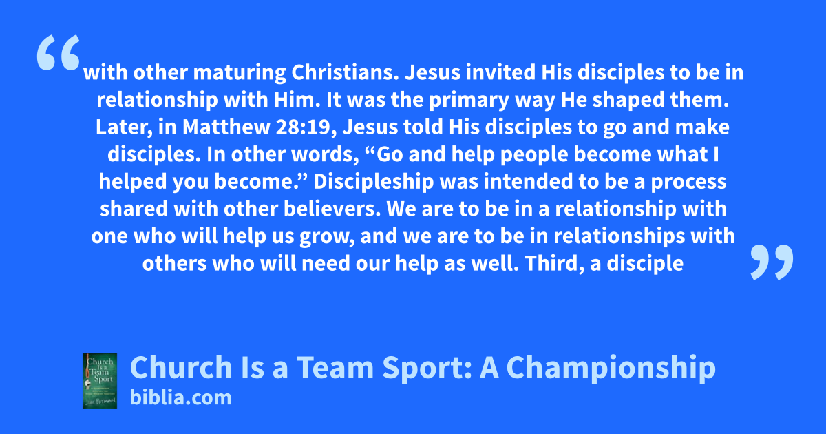 with other maturing Christians. Jesus invited His disciples to be in relationship with Him. It was the primary way He shaped them. Later, in Matthew 28:19, Jesus told His disciples to go and make disciples. In other words, “Go and help people become what I helped you become.” Discipleship was intended to be a process shared with other believers. We are to be in a relationship with one who will help us grow, and we are to be in relationships with others who will need our help as well. Third, a disciple