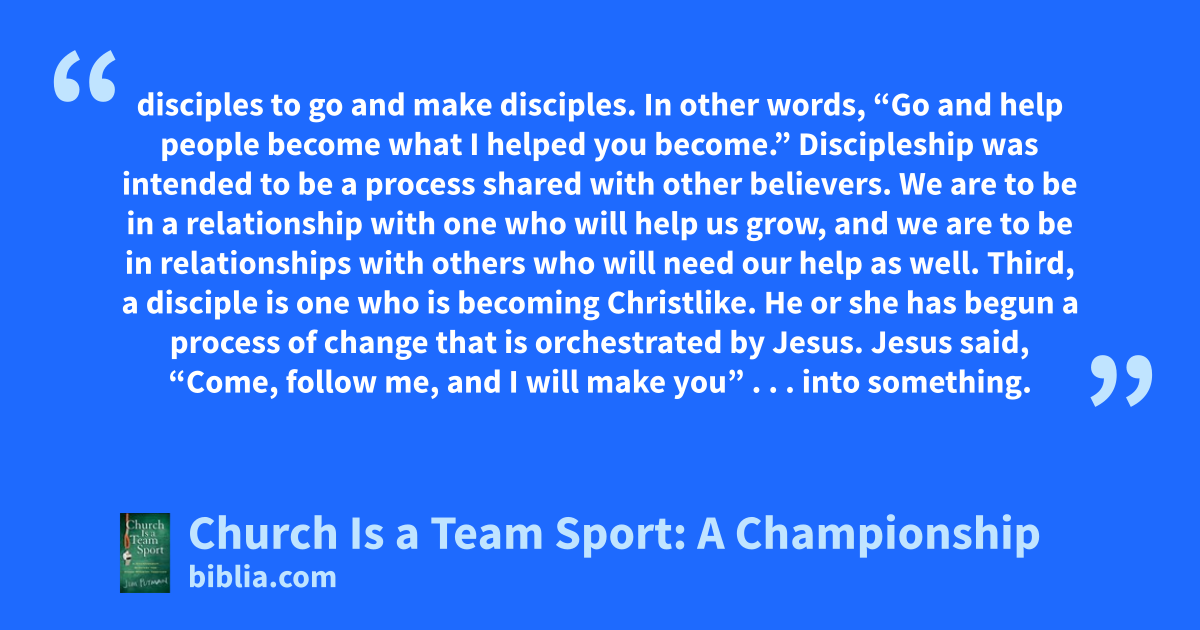 disciples to go and make disciples. In other words, “Go and help people become what I helped you become.” Discipleship was intended to be a process shared with other believers. We are to be in a relationship with one who will help us grow, and we are to be in relationships with others who will need our help as well. Third, a disciple is one who is becoming Christlike. He or she has begun a process of change that is orchestrated by Jesus. Jesus said, “Come, follow me, and I will make you” . . . into something.