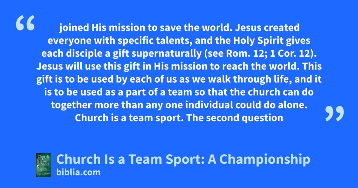 joined His mission to save the world. Jesus created everyone with specific talents, and the Holy Spirit gives each disciple a gift supernaturally (see Rom. 12; 1 Cor. 12). Jesus will use this gift in His mission to reach the world. This gift is to be used by each of us as we walk through life, and it is to be used as a part of a team so that the church can do together more than any one individual could do alone. Church is a team sport. The second question